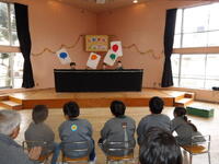 お話~素話『だってだってのおばあさん』(作・絵:さのようこ フレーベル館)・パネルシアター『うれしいひなまつり』『ぽんたのじどうはんばいき』(作:加藤ますみ 絵:水野二郎 ひさかたチャイルド社)・タングラムシアター『はっぱのぼうけん』を楽しみました。