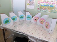 すみれ組が一生懸命に作ったプレゼントは、さくら組が小学校に行っても使ってもらえるように、「収納ボックス」です。ボックスには、さくら組さんにとってもとても大切な存在である幼稚園で飼育しているうさぎのちゃすけと、カメのさくらを画用紙切ったり貼ったりして作成し添付してくれました。