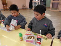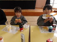 最後は、みんなでランチです。すみれ組は、さくら組や先生たちに、みんなで一緒に同じものを食べる経験も初めてのことでした。好きなメニューを聞き取り、みんなが喜んでくれるメニューにしてくれました。