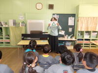 DVD『天使と悪魔の交通安全』を視聴しながら、「こんな時、自分ならどうする?」という問いかけに、子供たちは、どうしたらいいのか、自分なりに考えて答える姿が見られました。①絶対に飛び出しちゃだめ! ②歩道と車道の意味 ③信号機のある横断歩道の渡り方 ④道路標識の意味 について考える機会になりました。