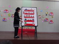 次に、ひなまつりの集いを一緒に行いました。園長先生方から、菱餅や橘・桜の意味を聞きました。また、お互いの園で製作した雛人形を紹介し合いました。各年齢に応じて経験させたい内容をもとに雛人形を作っています。