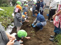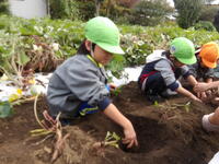子ども達が収穫しやすいように、金子さんが、弦を刈り取ってくださっていました。そして、「さつまいもは、土の中にいます。おいもを引っ張らずに、土をよけてから引き出してね。」と収穫の仕方をわかりやすく教えてくださいました。