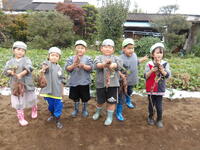 最後は、自分で掘ったさつまいもをリュックに入れ、ぱんぱんに膨らんだリュックをしょって、幼稚園まで頑張って歩いて帰ってきました。頑張って収穫した子ども達は、おなかがすいたようで、道すがら「焼き芋にして食べたいな!」「スイートポテトもおいしいよね!」等の会話が弾んでいました。