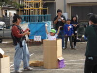 親子競技では、かくれんぼをテーマに、子ども達が隠れて保護者の方に見つけてもらうバージョンと、保護者の方が仮装して隠れて子ども達が見つけるバージョンで行いました。子ども達が隠れるバージョンでは、段ボールハウスの窓から手を出す子ども達の手を見たり、触ったりして、手だけを頼りに探してもらいました。
