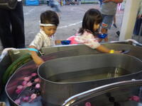 その1「すくってごらん(きんぎょすくい)」・・・生沼さんの特別な水槽にはスクリュー装置が付いているので、勢いよく流れる金魚たちを、みんな必死に金魚を追いかけてすくっていました。「あ~逃げないで。待ってまって~。」
