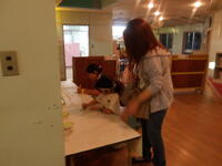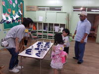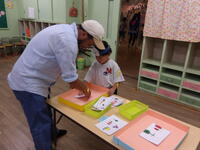 「さわってごらん」・・・とげとげ・ぺたぺた・ふわふわ・ひやひやっ 4つのボックスに手を入れるといろいろな感触がします。「え~なになに?」「なんだろう?」と、みんな、おっかなびっくり手を入れて楽しんでいました。