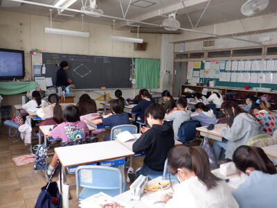 4年生: ひし形の特徴(向かい合う2組が平行、4辺の長さが等しい)を確かめて、ひし形をかきました。
