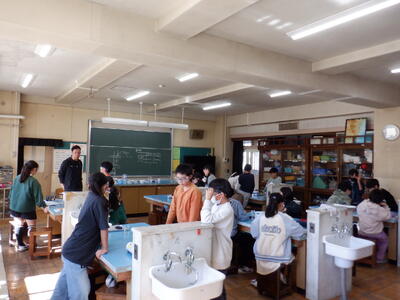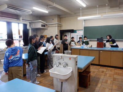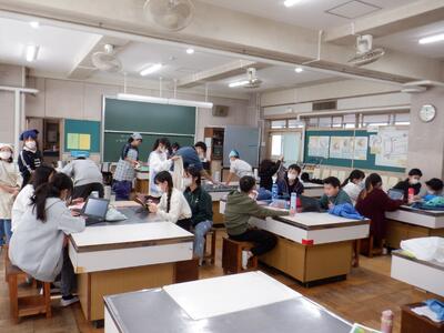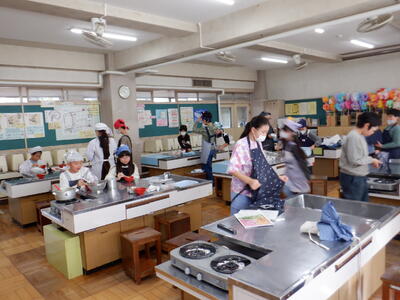 5年生: 「みそ汁」作りです。煮干しからだしをとり、油揚げや大根などを入れて美味しくできました。