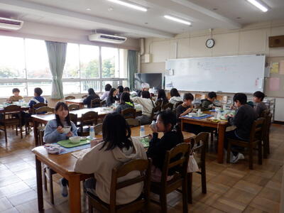 5年生: ランチルームでの楽しい給食です。今日のメニューは、麦ご飯、サバの味噌煮、五目汁でした。