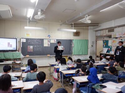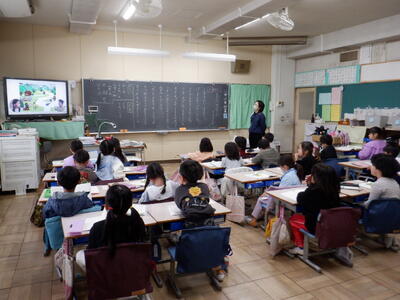 2年生: 「8の段の暗唱」です。モニターのタイマーで、時間を計測しました。10秒を切る子もいました。