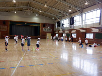 2年生: 「ボールを使った運動遊び」です。玉入れの白玉を、相手が捕球しやすいように投げています。