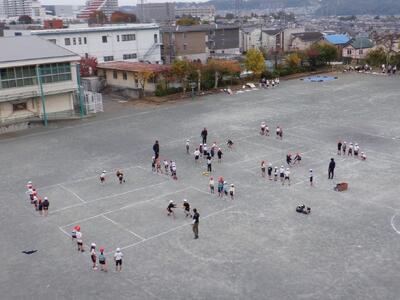3年生: タグラグビー教室です。日野RDの方から、タグの取り方やルール等を教えていただきました。