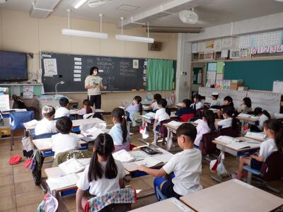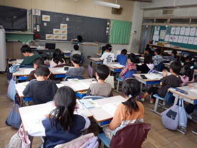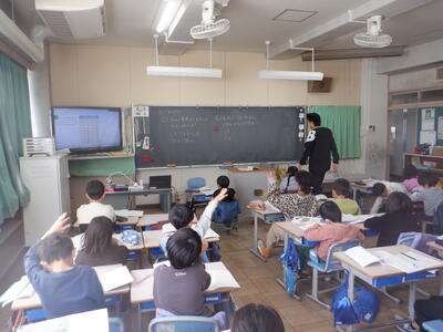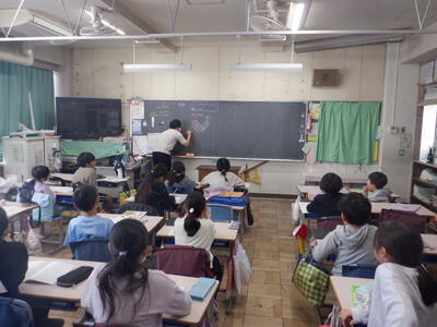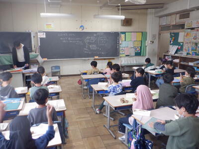 4年生:理科「わたしたちの体と運動」です。自分たちの腕の動きについて、⾻と筋⾁を関係付けて考えました。