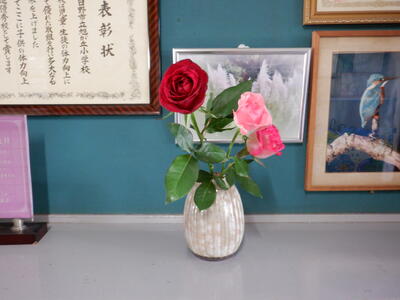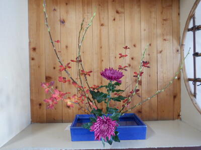 地域の方による生花です。3色のバラ(写真左)、赤芽やなぎ、菊、どうだんつつじ(写真右)です。毎月、季節感あふれる作品をありがとうございます。