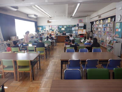 5年生:図書室で読書に親しんでいます。伝記や図鑑など、それぞれの楽しさを感じてほしいと思っています。