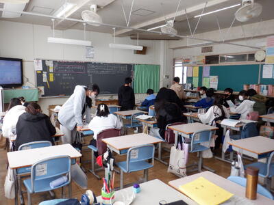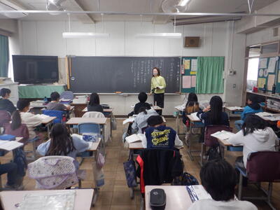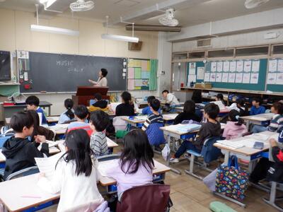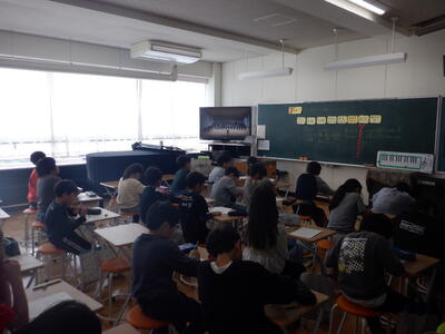 2年生: 「MUSIC」の練習です。PC等で検索し、家でも練習できるように作詞者名が伝えられました。