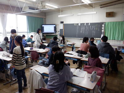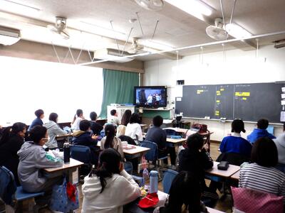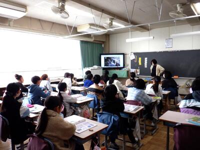 3年生:合唱の学習です。見本の映像から、歌う時の姿勢や口の開け方、表情、声の感じなどを学びました。