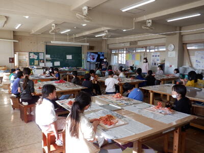 4年生:「うれシーサー」です。粘土が乾かないように気を付けながら、オリジナルのシーサーづくりをしました。