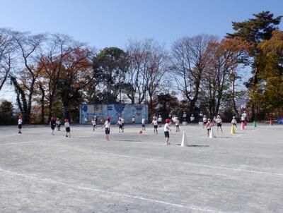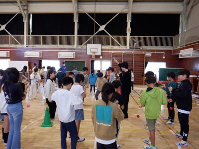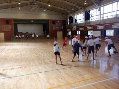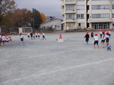 5年生:ゴール型ゲームです。その場で指定された人数のプレイヤーで、サッカーのようにゴールを目指します。