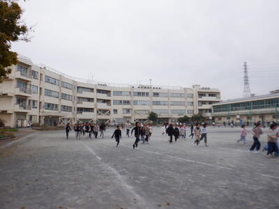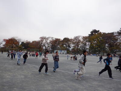 2年生: 持久走週間に向けた練習です。自分のペースを守って、3分間、校庭のトラックを走りました。