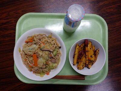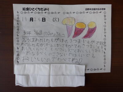 給食のメニューに、2年生が掘ったサツマイモを使った「大学イモ」が出ました。給食一口だよりには、2年生から各学級へのメッセージが書かれています。豊作に感謝しながら、全校で美味しくいただきました。