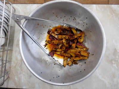 6年生: 「ベーコンポテト」づくりです。グループで分担しながら、手際よく進めることができました。