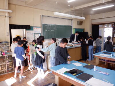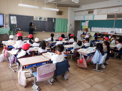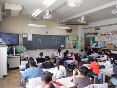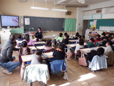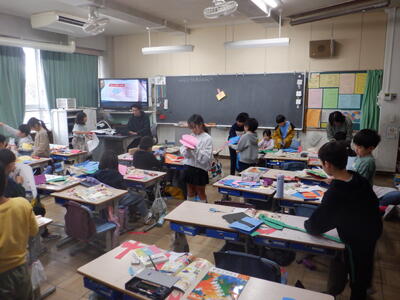 1年生: 「たぬきの糸車」です。糸車を引くたぬきに対する、おかみさんの気持ちの変化を考えました。