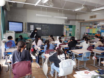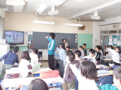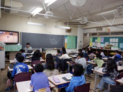 6年生:こちらも「イングリッシュキャラバン」です。準備した画面を使って、外国の方と交流しました。