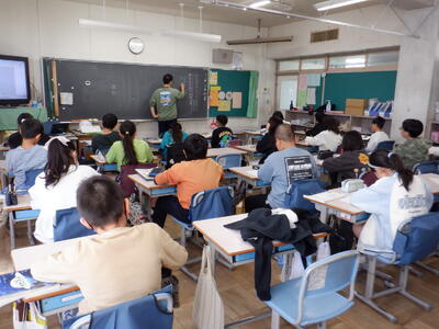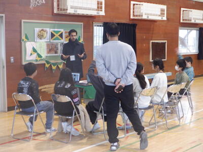 5年生:「イングリッシュキャラバン」です。英語のネイティブ人材を招いて、英語での交流活動をしました。