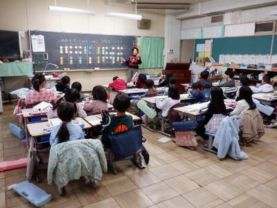 5年生: けん玉名人による特別授業です。超難度の技の披露や質問コーナーに続き、レベル別のワークショップを行っていただきました。けん玉に夢中になるひとときを、ありがとうございました。
