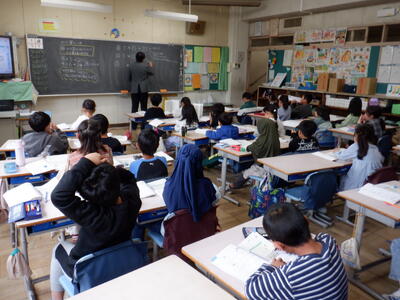 1年生: 「ひき算の問題づくり」です。公園で遊ぶ子供の数等を使って、ひき算の問題を作っています。