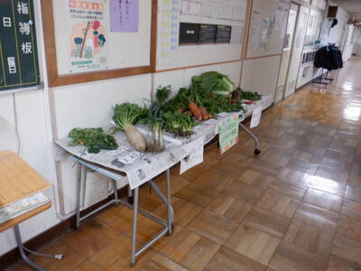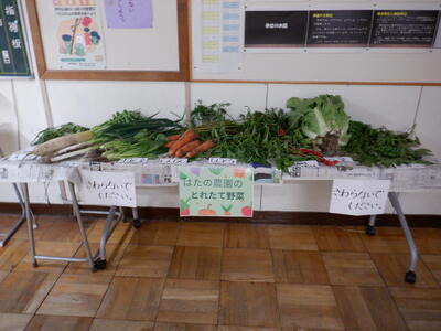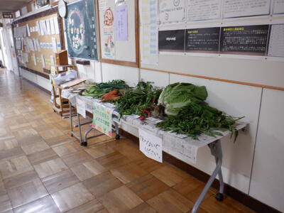 昨日、はたの農園さんからいただいた新鮮な野菜です。全9種類(きゅうり、大根、長ねぎ、小松菜、しし唐、人参、万願寺唐辛子、白菜、ピーマン)が2階廊下に展示されています。野菜嫌いな人も、野菜に親しんでほしいと思います。地場野菜を、みんなで美味しくいただきましょう!