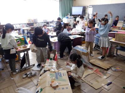 1年生:「はこでつくったよ」です。家から持ってきた箱を切ったり、積んだりしてお城やロボットを作りました。