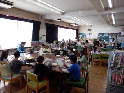 2年生: 読書の時間です。少しだけレイアウトが変わった図書室で、選んだ本を集中して読んでいます。
