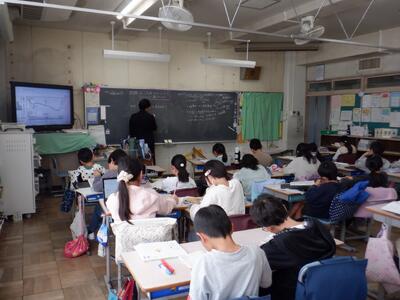 6年生:反比例の学習です。一方の値が1/2、1/3と変化していくときの、もう一方の値の変化を考えました。