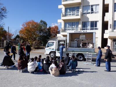 6年生: 起震車体験です。全員が最高震度7を体感しました。消防署の皆様、ありがとうございました。