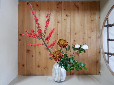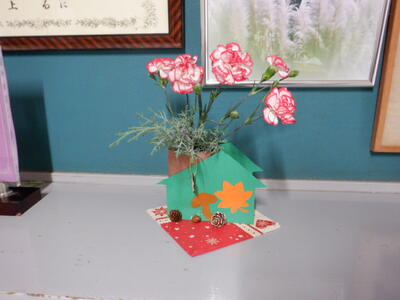 地域の方による生花です。花名は、ブルーアイス、スプレーカーネーション(写真左)、梅もどき、菊、山茶花(写真右)です。山茶花は、「たきび(童謡)」の歌詞にも出てきます。ちなみに、12/6(土)は、たき火祭です。今月もすてきな生花をありがとうございました。