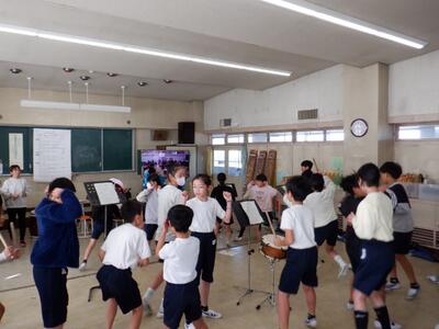 5年生: 「ぶちあわせ太鼓」です。「ソーレ」の掛け声で、3~4人 が交代して叩く練習をしています。