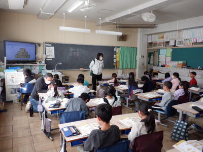 5年生:「図形の面積」です。底辺が一定の三角形は高さが変わると面積はどう変化するかを考えました。