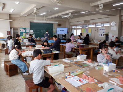 4年生: 「うれシーサー」の色塗りです。体の部分は粘土素材を活かし、目等のパーツを塗っています。