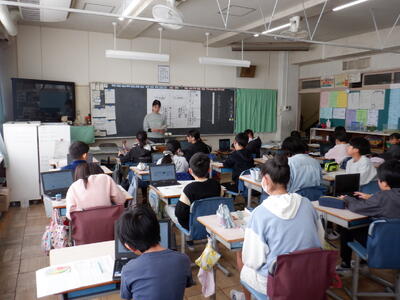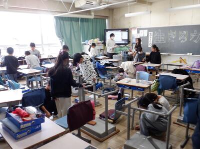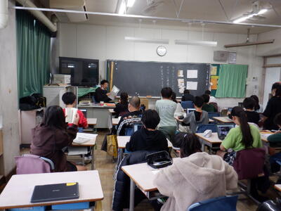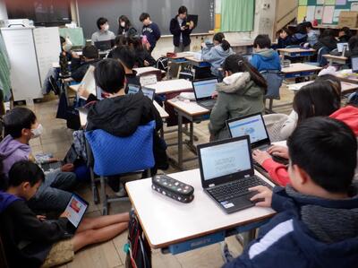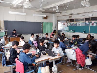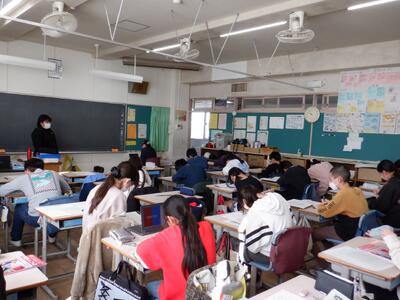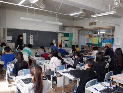 4年生: 「災害が起きたらどうする」です。地震発生後の行動等を、PC画面で作文にまとめています。