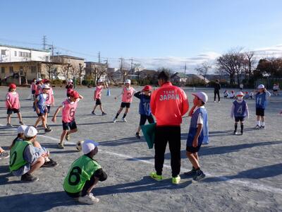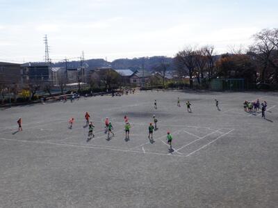 4年生: 「タグラグビー」です。おとり作戦など、チームで作戦を工夫しながらゲームをしています。