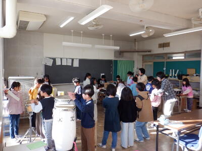 1年生: 音楽会の楽器の説明です。すず、大太鼓など、希望する楽器ごとにオーディションを行います。