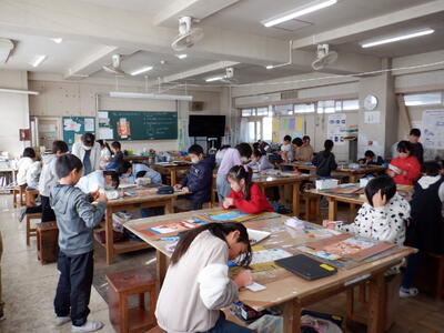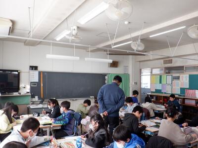 6年生: 「卒業アルバム文集」の清書です。下書きをよく見ながら、一字一字心を込めて書いています。
