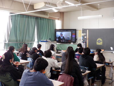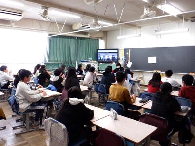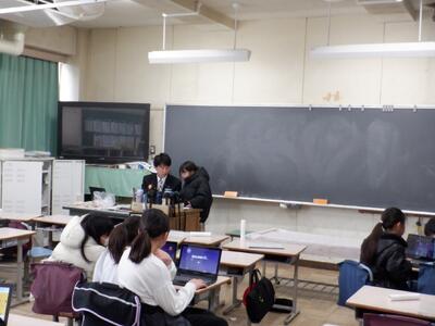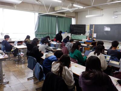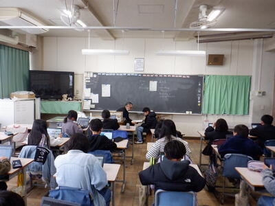 1年生: ①通知表を見ながら、2学期の振り返りをしています。②体力テストの練習動画を視聴しています。