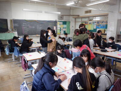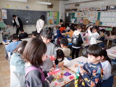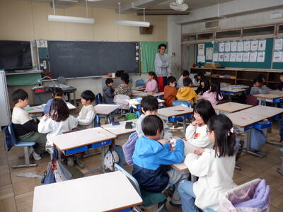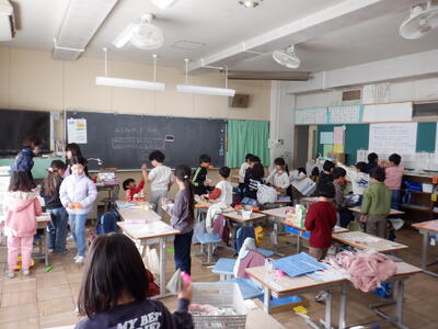 1年生: 「おたのしみ会」です。係の発表や風船バレー、ジャンケン列車等をして楽しく過ごします。