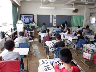 3年生: 書初めの練習です。「お」の曲げや「正・月」の横線の等間隔等に気を付けて書いています。