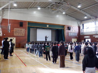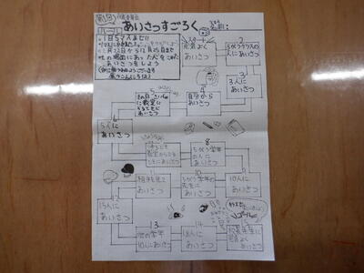 代表委員から「あいさつ運動」のお知らせがありました。1回目は、12/22~25の4日間です。あいさつ双六の内容をクリアすると、1日5マスまで進めます。ゴールを目指しながら、学校に挨拶の輪を広げましょう!