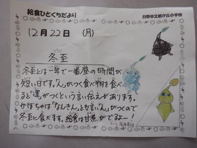 今日は冬至です。給食に、かぼちゃの甘煮が出ました。さらに、さわらの柚子味噌焼きと9種類の具材が入った豚汁も出ました。季節感に溢れた栄養満点の給食も、旭小の自慢の一つです。栄養士さん、調理員さん、生産者さんに感謝しながら、美味しくいただきました。