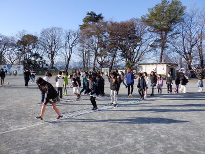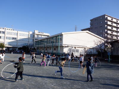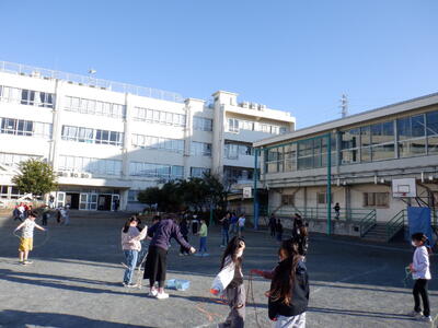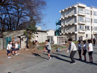 5年生: 長縄跳びです。2チームに分かれて、8の字跳びと人数跳び(7人をクリア!)の練習をしています。
